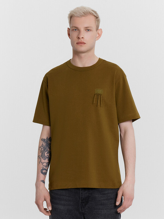 Футболка изготовлена из трикотажного полотна кулирка. Футболка свободная, прямого силуэта. Длина до линии бедер. Горловина округлой формы обработана бейкой из рибаны. Шов втачивания бейки распошит. Плечо слегка спущено. Рукава втачные короткие.