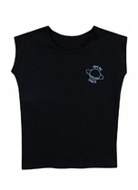 Нижние срезы футболки и рукавов обработаны швом вподгибку.
