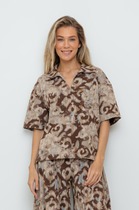 Горловина округлой формы обработана обтачкой из рибаны. Шов втачивания обтачки по спинке закрыт тесьмой хб 10мм.Рукава втачные, корткие. Линия плеча спущена.