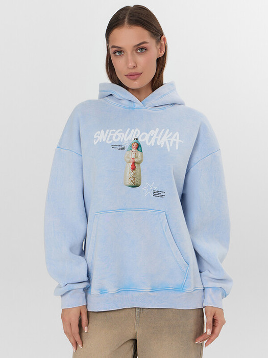 Голубое теплое худи с надписью «Снегурочка» создано для уютных зимних дней. Модель свободного оверсайз кроя со спущенным плечом обеспечивает комфорт и современный силуэт. Просторный капюшон и вместительный карман-кенгуру добавляют практичности в повседневной носке.