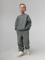 Худи свободного силуэта для мальчиков с капюшоном. Горловина округлой формы. Капюшон со средним швом, на подкладке из основного полотна. Плечо спущено, рукав втачной длинный. По низу рукава отрезная манжета из рибаны. Пояс отрезной из рибаны.Брюки для мальчиков. Без бокового шва. Карманы в вытачке. Пояс отрезной с внутренней эластичной тесьмой. Пояс прострочен двумя отделочными строчками. Внутри в пояс втянут шнур. Низ брюк обработан манжетами из рибаны.