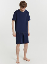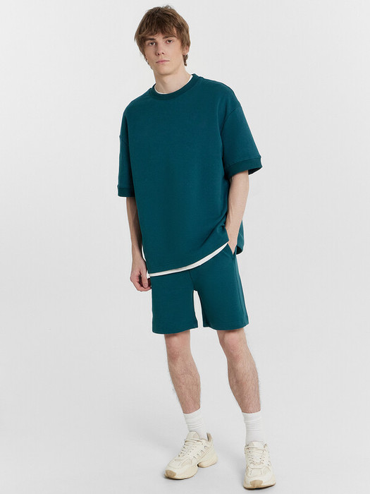 Шорты свободного силуэта. Длиной до колен. Пояс  отрезной с эластичной тесьмой внутри. С внешней стороны пояса пробиты петли и  вставлен шнур с эглетами. Боковые швы перенесены на деталь переда. В боковых швах обработаны карманы. Подкладка карманов из кулирного полотна. Нижние срезы шорт застрочены.