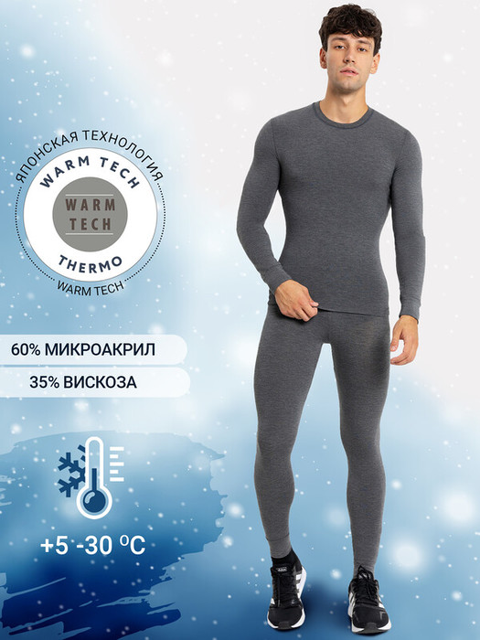 Мужской термо-компдект из полуприлегающего джемпера длиной до линии бедер и облегающих брюк. Рукава джемпера длинные, на манжетах, горловина круглая. Брюки без боковых швов, на манжетах, с эластичной тесьмой в поясе. Все швы плоские и комфортные. В состав полотна, созданного по японской технологии, входит микроакрил, который благодаря своей толщине (меньше волоса человека в 10 раз), создает своеобразные воздушные карманы между нитями – именно за счет этого свойства джемпер так хорошо согревает. Благодаря эффекту натуральной шерсти выдерживает температуры до -30 градусов Цельсия. Зиму контролируете вы!