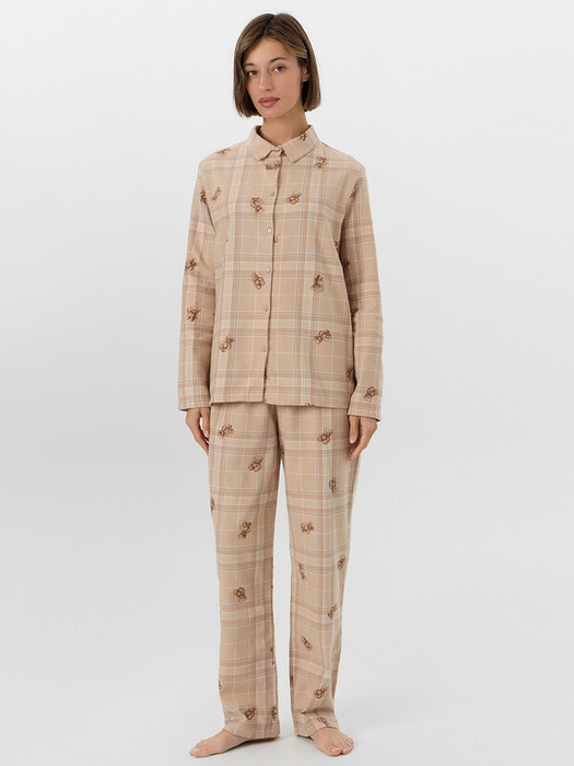 Брюки с широким эластичным поясом мягко сидят на талии, не оставляя следов, а клетчатый рисунок придает образу теплоту и домашний шарм. Этот комплект подойдет для сна, утреннего кофе или отдыха с книгой — он сочетает практичность и стиль.
