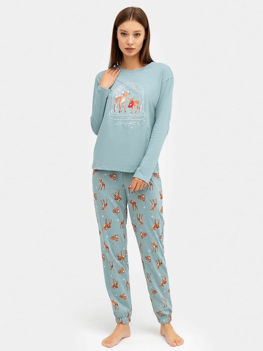 Горловина круглой формы с притачной обтачкой из основного полотна. Рукава длинные втачные. Перед и спинка цельнокроеные. Низ джемпера и рукавов обработан швом в подгибку. Брюки длинные, немного заужены к низу. Пояс цельнокроенный с эластичной тесьмой внутри. Низ брюк застрочен с эластичной тесьмой внутри.