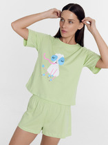 Перед и спинка джемпера цельнокроеные. Вырез горловины круглый, обработан притачной обтачкой из бейки. Рукава втачные короткие одношовные. Низ изделия и рукавов обработан швом в подгибку. Брюки длинные. Пояс цельнокроенный с эластичной тесьмой внутри.