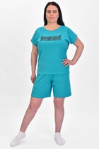 Комплект состоит из джемпера и брюк свободного силуэта. Длина джемпера ниже талии. Перед и спинка цельнокроеные. Рукава втачные, длинные, спущенная линия плеча. Горловина округлой формы, обтачка из основного полотна. Низ изделия и рукавов в подгибку.