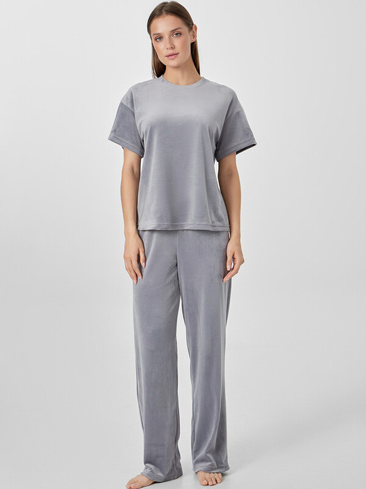 Джемпер прямого кроя с круглой горловиной и короткими рукавами не сковывает движения, а аккуратная обработка швов гарантирует комфорт. Брюки с высокой посадкой и широким эластичным поясом мягко фиксируются на талии, а практичные карманы-«хулиганы» добавляют функциональности.