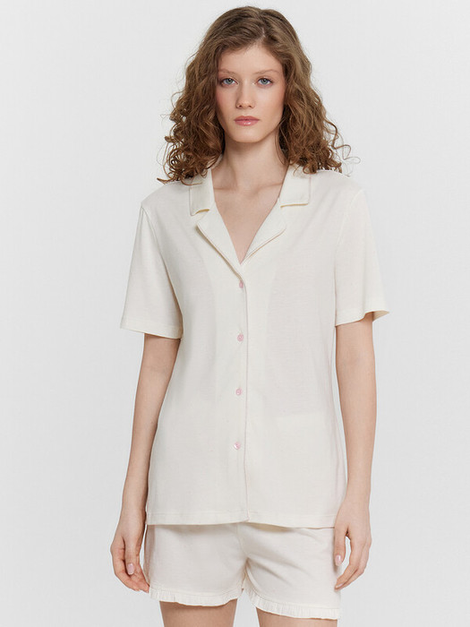 Эта красивая женская пижама свободного силуэта, выполненная из высококачественного хлопка, подарит вам комфорт на весь день и всю ночь. Горловина рубашки оформлена отложным воротником с лацканами, по краю которого проходит атласный кант, добавляющий изысканности и элегантности. Короткие рукава делают рубашку идеальной для теплой погоды, а центральная застежка на пуговицах обеспечивает удобство и стиль. Шорты свободного силуэта, декорированные рюшами по низу, добавляют образу очарования и женственности. Хлопковый материал обеспечивает легкость и приятные ощущения на коже, при этом пижама не жаркая, благодаря легкой и слегка тянущейся ткани, которая не сковывает движений. Эта модель подойдет как для сна, так и для домашних дел.