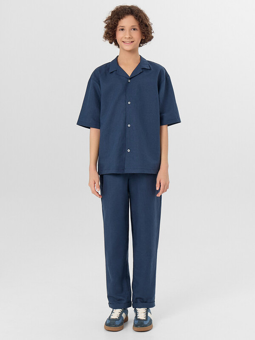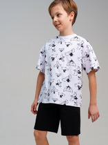 Комплект из двух предметов. Жакет прямого силуэта с воротником. По переду обработана застежка на пуговицы d=10mm и петли. Рукава короткие, втачные, слегка спущены. Нижние срезы изделия и рукавов обработаны швом в подгибку. Брюки прямого силуэта. Посадка средняя. Пояс цельнокроеный с эластичной тесьмой внутри. На поясе пробиты петли, заправлен шнур из основного полотна. По переду имитация гульфика, обработаны карманы с наклонным входом от боковых швов. Низ изделия с отворотами.