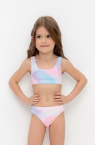 Трикотажное эластичное полотно. Трикотажное полотно, подкладка для купальников. Передняя и задняя детали топа, передняя и задняя детали трусов цельнокроенные. Подкладка передней детали топа и подкладка ластовицы, передней детали трусов из трикотажного полотна. Верхние и нижние срезы трусов и топа обработаны бейкой из основного полотна. По спинке топа застежка. Бретели из основного полотна с надставками, регулируются по длине сзади.