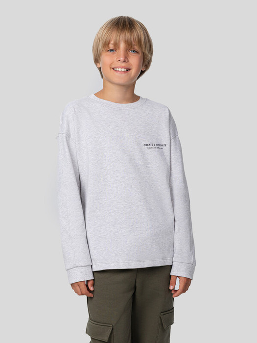 Лонгслив для мальчиков свободного силуэта. Рукава втачные длинные с двумя швами, с отрезными манжетами из рибаны. Плечо слегка спущено. Горловина округлый формы с обтачкой из рибаны. Спинка цельнокроеная . Низ изделия швом вподгибку.