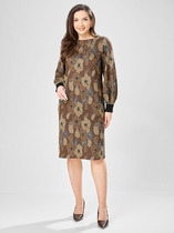 Платье женское полуприлегающего силуэта из трикотажного полотна селаник. Горловина круглой формы с воротником-стойкой, пройма углублена. Рукав полуреглан вверху обьемный со средним швом, к низу идет на заужение. На передней детали средний шов с разрезом по низу. Спинка с центральным швом и застежкой на потайную молнию. Длина платья ниже колена.