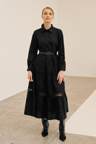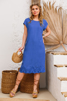 Нижняя часть платья с расклешением. Длина выше колен. Низ платья и рукавов обработан швом вподгибку.