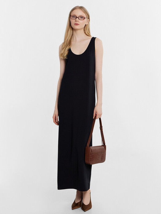 Платье на широких бретелях свободного силуэта, длиной макси. Горловина круглая, глубокая. Проймы углублены. Горловина и проймы окантованы бейками в 4 сложения из основного полотна. Нижние срезы обработаны швом вподгибку.