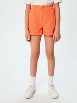 Шорты для девочек свободного силуэта из ткани. Посадка высокая. На детали переда карманы с отрезным бочком. Пояс отрезной с эластичной тесьмой RV40 внутри, на поясе пробиты петли и вставлен шнур из основного полотна. Шов втачивания пояса распошит. Длина выше колена. Низ обработан швом вподгибку с закрытым краем.