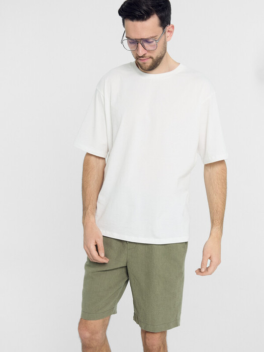 Текстильные шорты с классической линией талии длиной выше колен. Полотно выполнено из натурального хлопка и льна. Пояс отрезной, с регулировочным шнурком в талии. Есть удобные карманы «хулиганы». На передней левой детали проложены отделочные строчки – имитация гульфика. Стильный выбор!