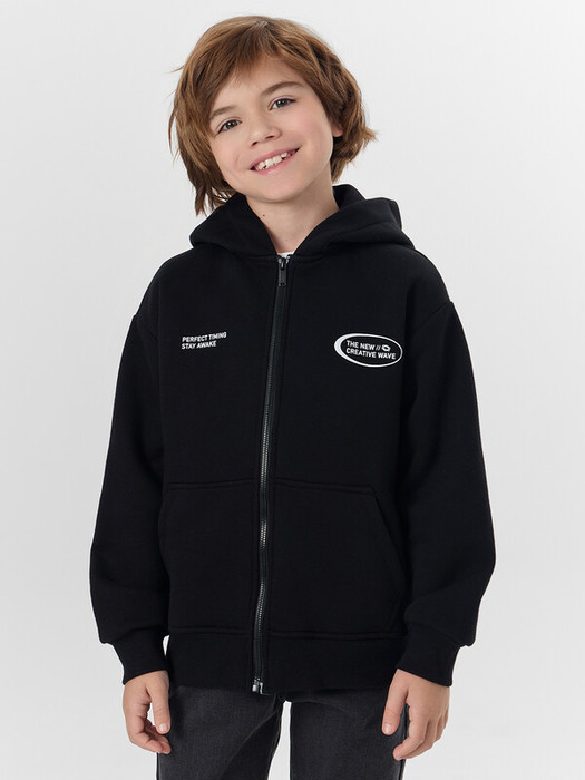 Жакет для мальчиков прямого силуэта с капюшоном. Капюшон на подкладке из основного полотна. Шов втачивания капюшона закрыт х/б тесьмой. Рукава втачные, линия плеча спущена. Притачные манжеты по низу рукавов и притачной пояс из рибаны. По переду застежка молния, карман кенгуру.