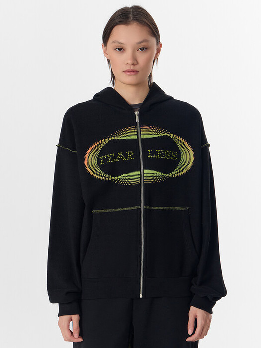Толстовка женская свободного силуэта. Перед и спинка цельнокроеные. Рукав втачной, длинный, спущенный. По низу изделия и рукавов пояс и манжеты из рибаны. Толстовка с капюшоном и центральной застежкой с молнией (OpenEnd Standart Metal №5, 5,9мм). По центру изделия накладные карманы. Толстовка двусторонняя, боковые швы, швы рукавов и кармана вывернуты наружу.