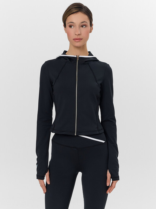 Функциональный дизайн включает капюшон с усиленными бейками по краю и потайной карман на спинке для безопасного хранения мелочей. Фигурные рельефные швы спереди и сзади не только добавляют стильный акцент, но и улучшают посадку изделия по фигуре. Центральная застежка-молния обеспечивает удобство использования.