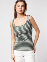 Топ женский изготовлен из трикотажного полотна интерлок. Топ облегающего силуэта на широких бретелях. Вырез горловины округлый.