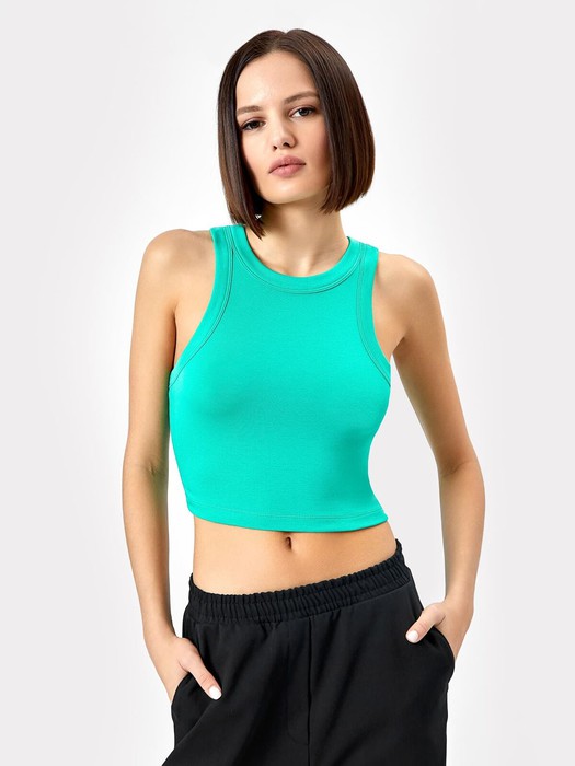 Стильный топ прилегающего силуэта. Выполнен из хлопковой трикотажной рибаны. Длина топа до линии талии. Вырез круглый, пройма "американского" типа. Рекомендуем для спорта и отдыха!