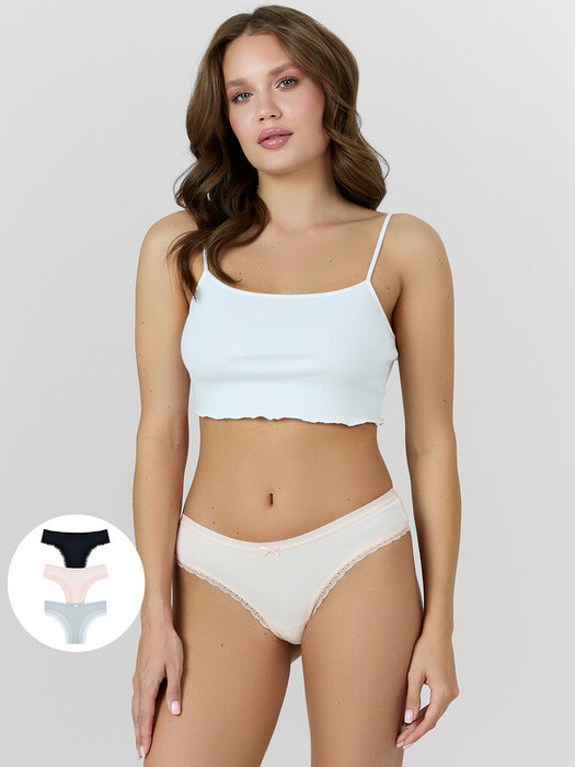 Мультипак (3 штуки) хлопковых слип-бикини из натурального, гипоаллергенного, дышащего полотна. Линия талии невысокая. По поясу и ножкам – нежная кружевная лента. Отличный повседневный вариант в базовой расцветке!