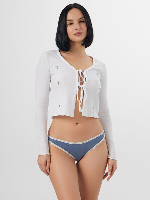 Передняя деталь цельная. Ластовица отлетная по переднему срезу, выполнена из кулирного полотна. Нижние и верхний срезы обработаны узким кружевом 15мм на плоскошовной машине. По верхнему срезу с изнаночной стороне эл. тесьма 6мм (жилка wt4-6, девсел 13460w).
