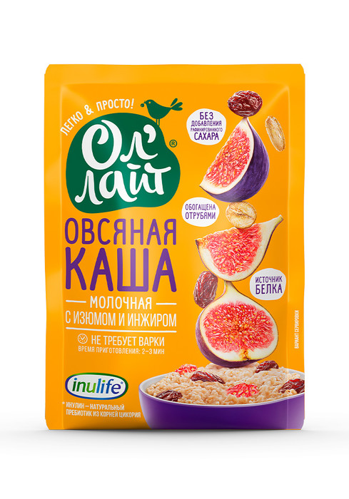 Сбалансированная овсяная каша ОлЛайт с изюмом и инжиром без добавления сахара, содержит медленные (правильные) углеводы и пищевые волокна, в том числе инулин, поэтому она надолго придает чувство сытости, наполняя организм энергией и поддерживая аминокислотный баланс на протяжении длительного периода времени.