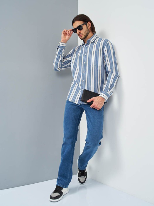 Мужские модные джинсы с пятью карманами. Посадка Slim fit (облегающие по бедру), средняя талия спереди, высокая сзади.. Застежка на молнии. Немного зауженные к низу. Выполнены из слабоэластичной ткани denim comfort stretch. Классическая средняя стирка с потёртостями и "усами" спереди и потёртостями сзади.