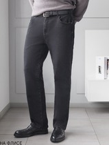 Мужские классические джинсы с пятью карманами. Посадка Regular fit (полуоблегающие по бедру), высокая талия, немного заужены к низу. Застежка на молнии. Выполнены из слабоэластичной ткани denim comfort stretch, цвет ткани Black/Black (лицевая и изнаночная стороны ткани черные). Темная стирка с потёртостями и "усами" спереди и потёртостями сзади.