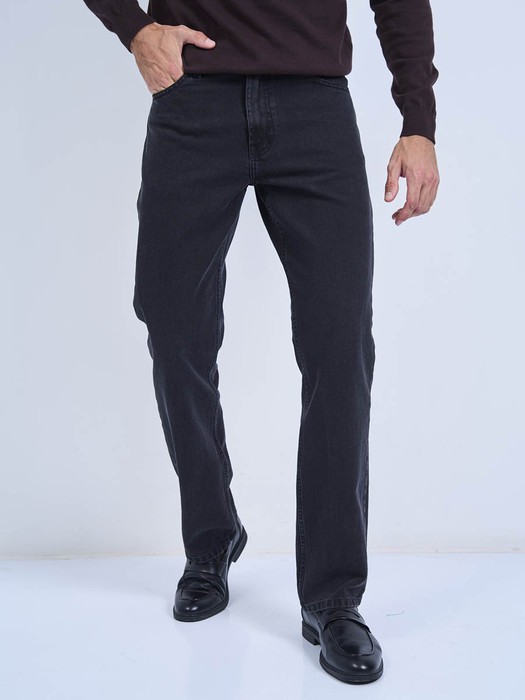 Мужские классические джинсы с пятью карманами. Посадка Regular fit (полуоблегающие по бедру), высокая талия, немного заужены к низу. Застежка на молнии. Выполнены из традиционной хлопковой ткани denim, цвет ткани Black/Black (лицевая и изнаночная стороны ткани черные) .Классическая темная стирка с потёртостями только по швам.