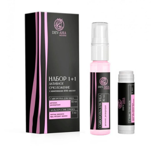 Набор «Активное омоложение» DEV-AHA с ретинолом, ресвератроломи АНА-кислотами — это комплексный уход нового поколения для зрелойи нуждающейся в восстановлении кожи. Дуэт сыворотки и стика для век активизирует природные процессы омоложения, сокращает выраженность морщин и наполняет кожу жизненной энергией. Сыворотка для лица с ретинолом, ресвератролом и АНА-кислотами —это омоложение на клеточном уровне, в ее основе мощные антивозрастные компоненты. Ретинол и ресвератрол стимулируют выработку коллагена, ускоряют обновление клеток и борются с признаками старения. Гиалуроновая, винная и яблочная кислоты глубоко увлажняют, возвращая коже упругость и гладкость. Настои бессмертника и шиповника, а также экстракты арганы и виноградной косточки насыщают кожу антиоксидантами, питаюти укрепляют. Формула на основе натуральных экстрактов и настоев обеспечивает мягкое, но мощное действие.
