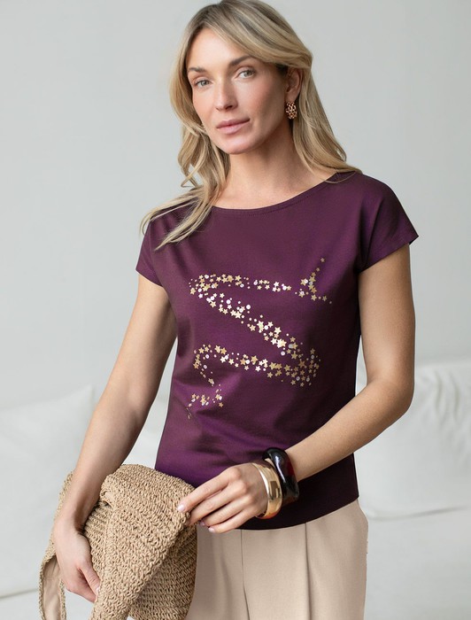 Состав: 92%Хлопок 8%ПУ Плотность: 150 Г/м2Футболка цвета бургунди идеально подходит для вечеринки и создания яркого образа. Оригинальный блестящий принт из устойчивой фольги в виде новогоднего символа змеи золотистого цвета придает изделию шикарный вид, который привлечет внимание на любом мероприятии. Модель с вырезом лодочка и цельнокроеным коротким рукавом обеспечивает свободу движений и комфорт в носке. Такой фасон изделия подходит на большие размеры, гармонично сидит на фигуре и помогает создать легкий акцент на достоинствах. Аккуратный вырез лодочка красиво подчеркивает шею и делает образ элегантным, сохраняя актуальность для разных случаев — от рабочих встреч до вечерних прогулок и праздничных мероприятий.