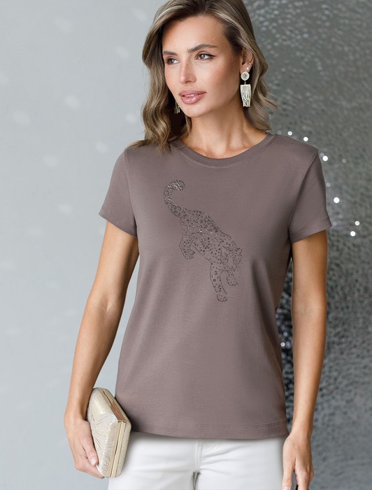 Состав: 92%Хлопок 8%ПУ Плотность: 170 Г/м2Стильная базовая футболка кофейного цвета с серебристым принтом фольгой выполнена из плотного хлопка с эластаном для комфортной посадки на любую фигуру. Прямая футболка классического кроя с круглым вырезом, прекрасно подходит для разных типов фигуры, в том числе и на большие размеры. Мягкость хлопка вместе с небольшой долей эластана гарантирует идеальную посадку и свободу движений. Легкая натуральная дышащая ткань премиального качества делает футболку с коротким рукавом идеальным вариантом для повседневной носки дома, на работу или офис. Однотонная футболка дополнена авторским аккуратным принтом с изображением леопарда, который придает праздничный и элегантный вид без лишней вычурности. Блестящий анималистичный принт аккуратно украшает, добавляя изысканный акцент и создавая легкий мерцающий эффект.
