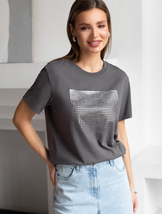 Состав: 92%Хлопок 8%ПУ Плотность: 170 Г/м2Стильная базовая футболка темно-серого цвета с серебристым принтом фольгой выполнена из плотного хлопка с эластаном для комфортной посадки на любую фигуру. Прямая футболка классического кроя с круглым вырезом, прекрасно подходит для разных типов фигуры, в том числе и на большие размеры. Мягкость хлопка вместе с небольшой долей эластана гарантирует идеальную посадку и свободу движений. Легкая натуральная дышащая ткань премиального качества делает футболку с коротким рукавом идеальным вариантом для повседневной носки дома, на работу или офис. Однотонная футболка дополнена авторским аккуратным принтом с минималистичной надписью, который придает праздничный и элегантный вид без лишней вычурности. Блестящий принт аккуратно украшает, добавляя изысканный акцент и создавая легкий мерцающий эффект.