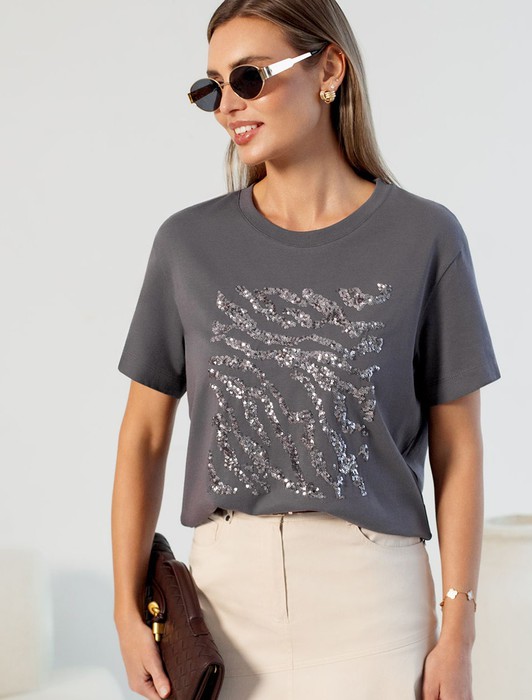 Совместные закупки Екатеринбург Женская одежда Футболки — Нарядная футболка с принтом пайетками из премиального хлопка с эластаном