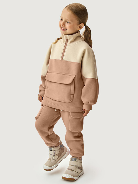Костюм ХИП-ХОП из плотного хлопкового трикотажа с мягким стриженным начесом внутри. Состоит из двух предметов — анорака и брюк.  Анорак свободного силуэта, воротник-стойка на молнии, большой накладной карман с боковыми входами.  Манжеты, пояс и воротник из трикотажного полотна «кашкорсе». Брюки свободного силуэта, зауженные к низу, с боковыми карманами и накладными карманами, с трикотажными манжетами. Пояс с резинкой и со шнуром, для дополнительной регулировки объема по талии. Пояс и манжеты из трикотажного полотна «кашкорсе».Комплект можно носить в качестве самостоятельной одежды при t° от +10°С до +20°С, а также в качестве второго слоя под верхнюю одежду.Прекрасный вариант для прогулок и активного отдыха, в поездках просто незаменим. Комплект станет любимой вещью в гардеробе вашего ребенка. Рекомендуется предварительная стирка для удаления лишнего ворса с изделия.