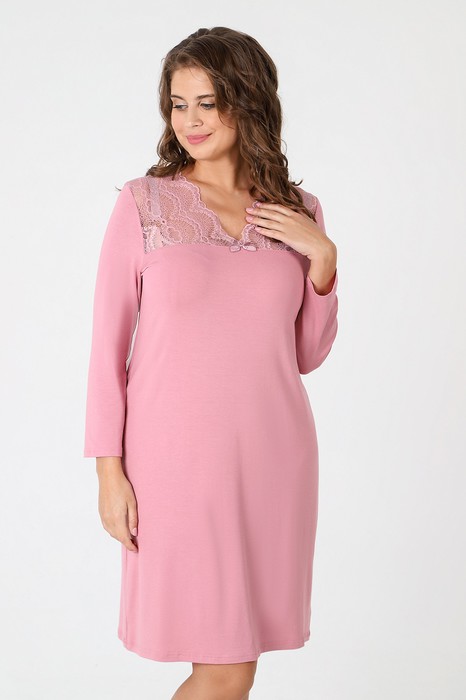 Сорочка женская из гладкокрашеного трикотажного вискозного полотна, прямого силуэта, с длинными втачными рукавами и горловиной V-образной формы. Перед с притачной кружевной кокеткой и декоративным бантиком из узкой атласной ленты в центре соединительного шва.