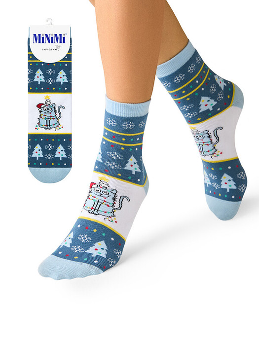 Женские праздничные носки MiNiMi с новогодним рисунком и мягким плюшем на внутренней стороне. Изготовлены из высококачественного хлопка, который позволяет коже дышать, отлично впитывает влагу и подходит для чувствительной кожи. Добавление эластана и полиамида способствует увеличению износостойкости и прочности. Удобная резинка превосходно облегает, плюш на внутренней стороне сохраняет тепло, а кеттельный (плоский) шов на мыске создает дополнительный комфорт.