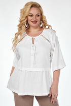 Блуза свободного силуэта из хлопковой ткани. Низ изделия с разрезами по бокам. Цельнокроеный короткий рукав. По центру передней части изделия выполнен шов с декоративной отстрочкой. По горловине сборка на изящные завязки с металлическими наконечниками.
