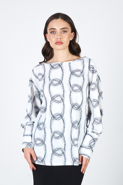 Блуза свободного силуэта из блузочной ткани. Втачной рукав на высокой манжете с застёжкой на пуговицы. Круглый вырез горловины обработан косой бейкой. По среднему шву спинки застёжка на петлю-пуговицу.