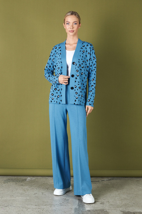 Костюм из брюк и кардигана. Брюки прямого силуэта из эластичного полотна. На передней части брюк застрочены стрелки. Пояс притачной с эластичной резиной. Кардиган из эластичного полотна с жаккардовым узором. Свободный силуэт с контрастной притачной планкой и застёжкой на пуговицы. Втачной длинный рукав в спущенную пройму.
