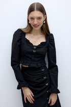 Блуза полуприлегающего силуэта с притачной планкой и застёжкой на пуговицы. Изделие из хлопковой ткани. На передней и задней части изделия выполнена кокетка с рюшей. Линия горловины оформлена плоским воротником в виде обтачки. Втачной рукав в романтическом стиле, присборен на резинку.