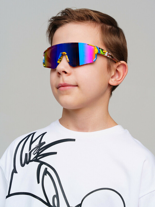 Солнцезащитные очки футуристической формы детские для мальчика. Солнцезащитные очки с фильтром Cat3. Ширина оправы - 131мм, длина дужки - 116 мм. Обхват головы 52-54 см. Тёмные фильтры блокируют 85% солнечных лучей такие очки эффективны для защиты глаз в тропиках, у моря и в горах. Очки транспортируются в картонной коробке. В комплект входит фирменный текстильный чехол из микрофибры, с помощью которого легко ухаживать за изделием.