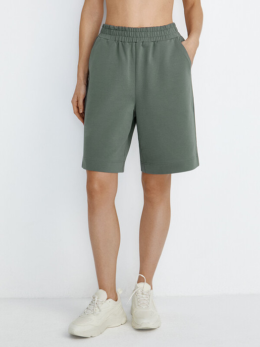 Женские свободные шорты средней длины с боковыми карманами и поясом на резинке.