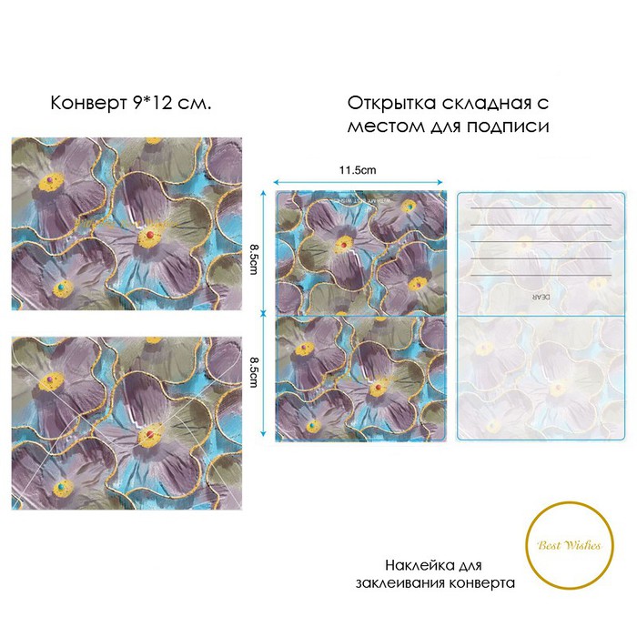Открытка + конверт ФИОЛЕТОВЫЕ ЦВЕТЫ НА ГОЛУБОМ ФОНЕ