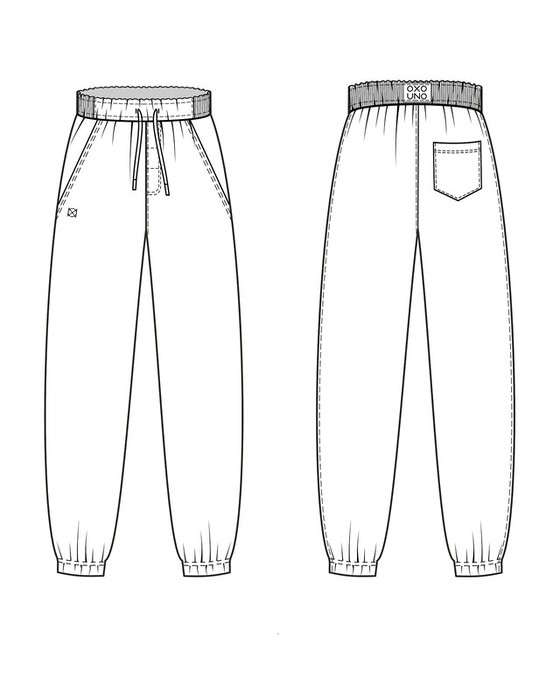Джоггеры свободного кроя с цельнокроенным манжетом на резинке. Боковые карманы, пояс из двух частей, отстрочен. В пояс вдет шнурок с термоусадкой на концах пояса. Декор - вышивка.