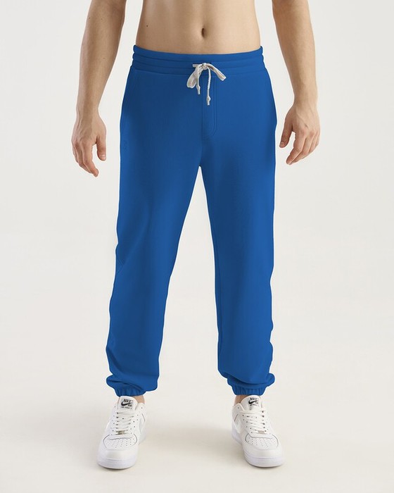 Мужские брюки, джоггеры с резинкой по низу брюк. Пояс из 2-х деталей, внутри резинка. По поясу отстрочка, петли,шнур. Боковые карманы с двойной отстрочкой, боковые швы отстрочены. Задний карман на правой задней половинке брюк.