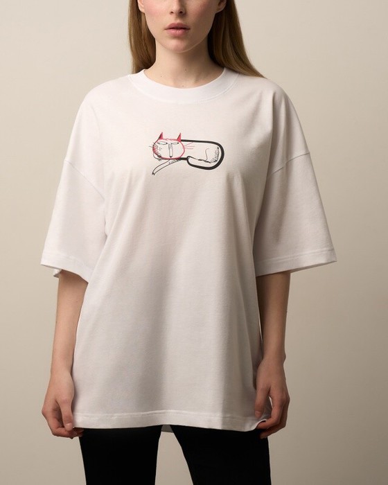 Футболка свободного силуэта. Спущенное плечо. Горловина из двух деталей, из рибаны.